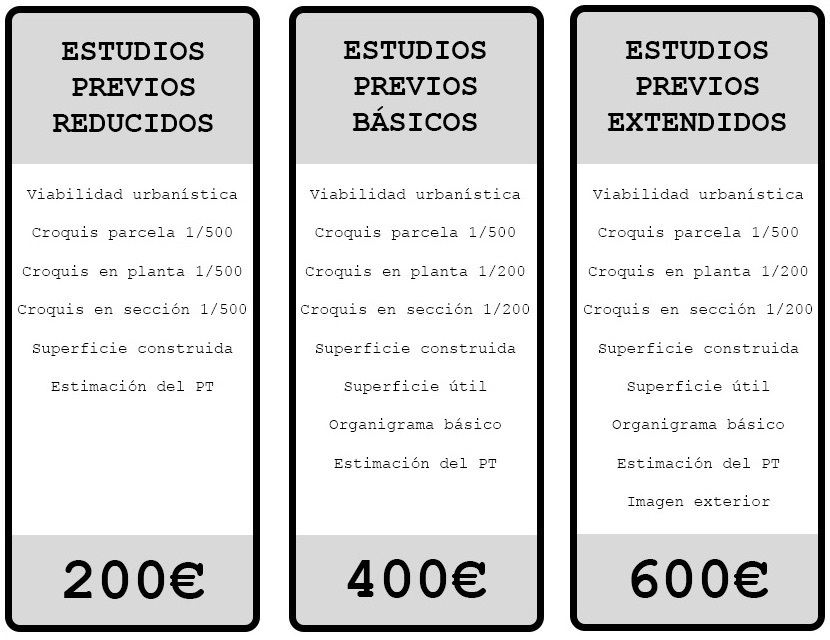 Tenemos TRES TARIFAS distintas de Estudios Previos una para cada situación en la que pueda encontrarse una persona que esté pensando en construir una casa. Cualquiera de ellos constituye la primera fase de un proyecto de arquitectura completo y pueden encargarse sin compromiso alguno.